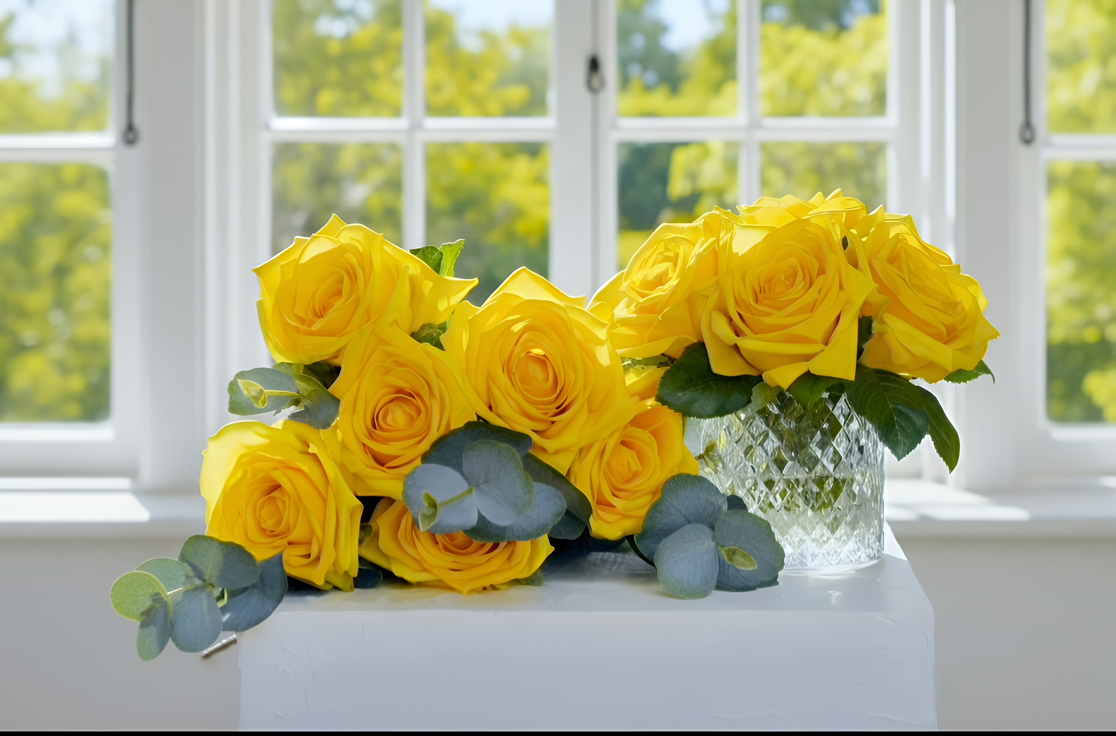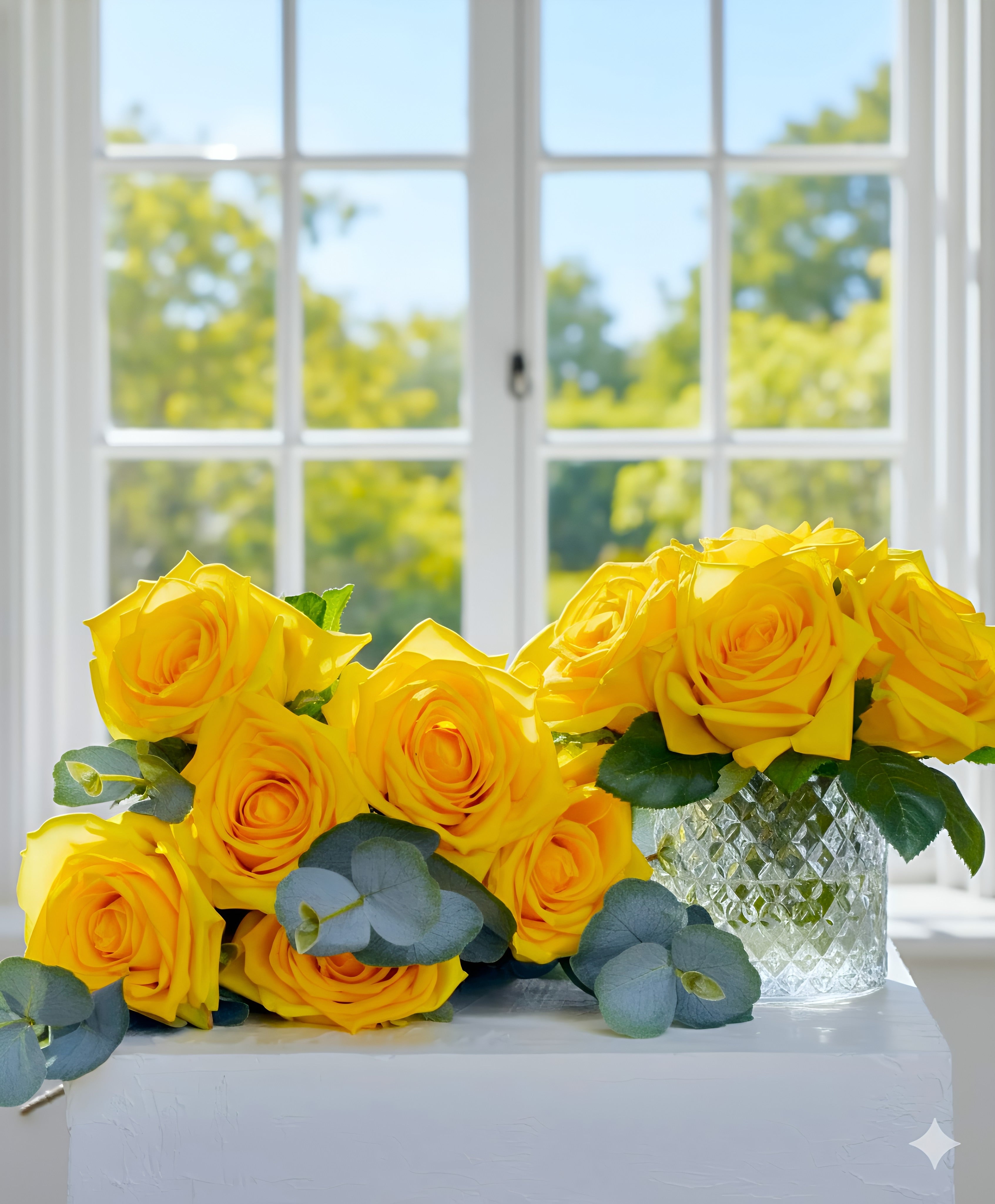 Real Touch Yellow Rose Permanently Set in illusion Water in Diamond Cut Glass Vase